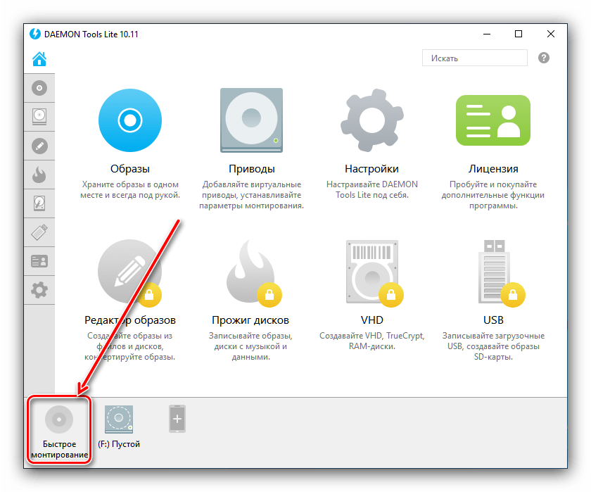 - Запустите программу, после чего нажмите на кнопку «Быстрое монтирование», которая расположена в нижнем левом углу интерфейса программы.