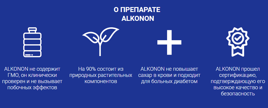 Необходимые клинические исследования проводились для того, чтобы исключить попадание в список компонентов описываемого препарата любых химических продуктов или ГМО. Именно благодаря этому препарат не имеет побочных эффектов, что гарантирует полную безопасность его применения. Каждый из активных компонентов выполняет определённую функцию, которая не мешает другим элементам лечебного комплекса. Отличный эффект наблюдается при курсовом употреблении Alkonon. Единственным противопоказанием к применению является индивидуальная непереносимость какого-либо из компонентов этого лекарственного средства.