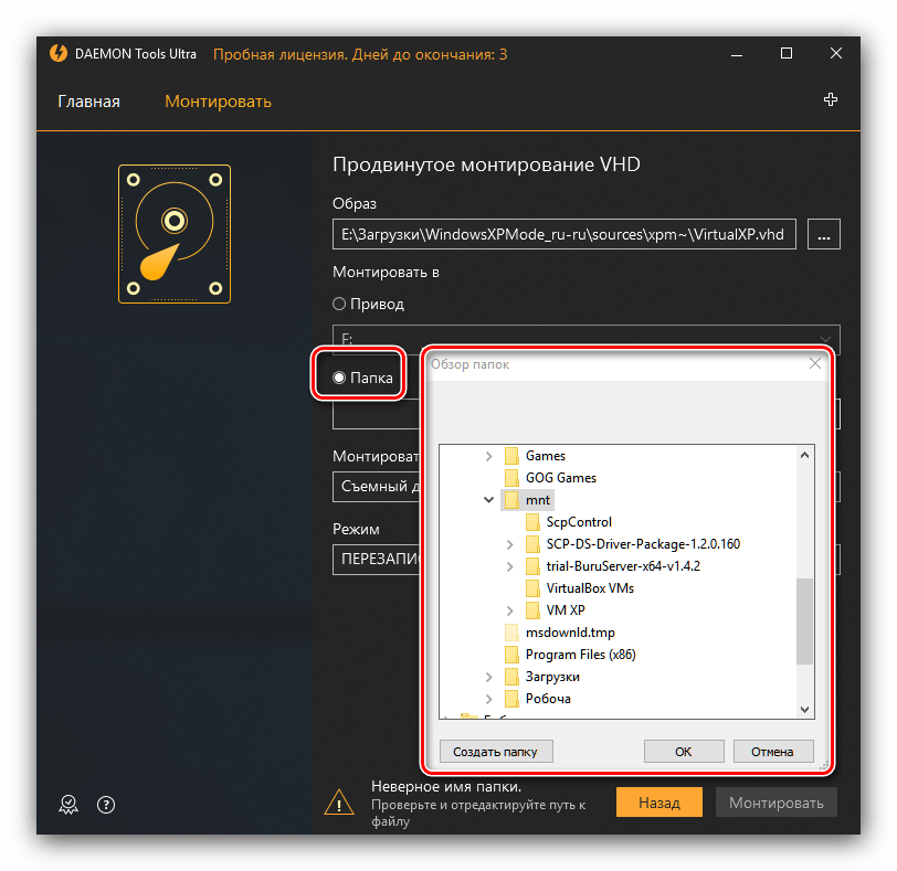 В окне монтирования первым делом нужно выбрать образ – воспользуйтесь кнопкой с тремя точками возле соответствующей строки.