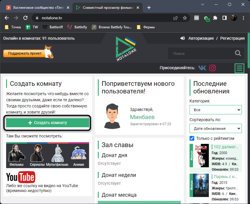 Откройте любой подобный сайт, я выбрал NotAlone. Нажмите кнопку «Создать комнату».