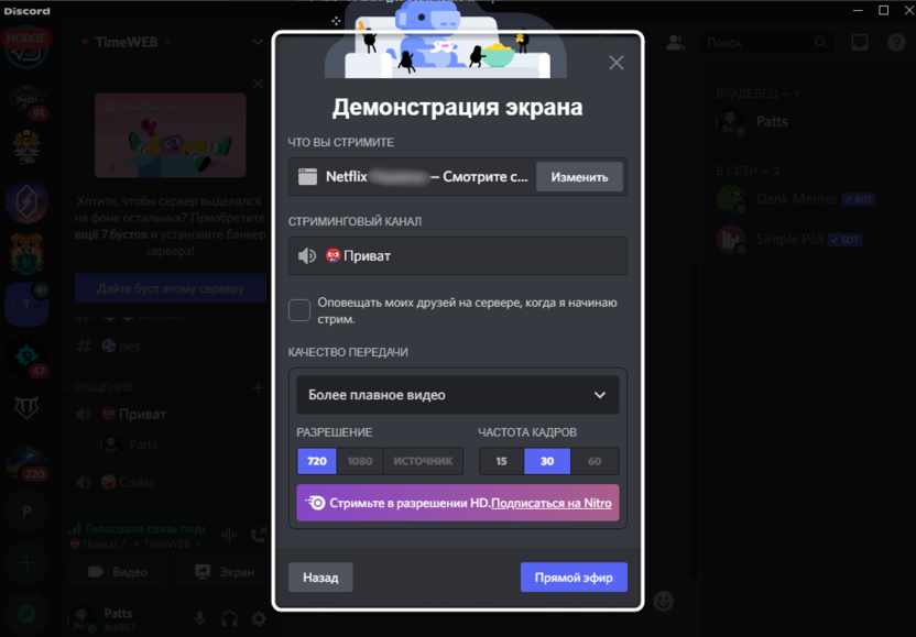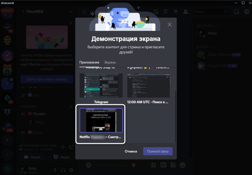 Как видите, начать трансляцию в Discord очень просто, вам даже не нужно включать интеграцию. Также вы можете работать в любом приложении и демонстрировать действия с помощью функции демонстрации экрана.