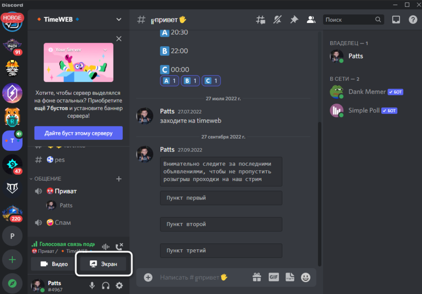 Теперь, когда вы выполнили предварительную подготовку, можно переходить к запуску стрима. Для этого необходимо подключиться к голосовому каналу сервера. Выберите один из каналов, который планируете использовать для проведения стрима, и кликните по его названию. Далее вы увидите всплывающее окно с кнопкой «Экран». Нажмите на нее, чтобы запустить трансляцию. Другой вариант начать стрим — кликнуть повторно по названию канала, а затем на иконку в виде монитора.