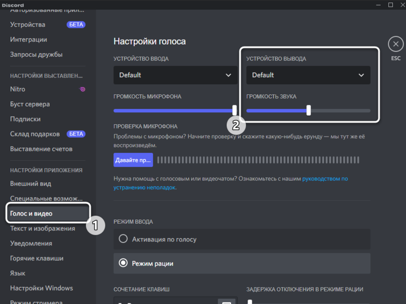 Далее откройте настройки в Дискорде, перейдите к разделу «Голос и видео» и убедитесь в том, что в качестве устройства вывода указано то же самое, что и в операционной системе. Кстати, в этом окне можно регулировать громкость звука отдельно, если это понадобится при совместном просмотре фильмов.