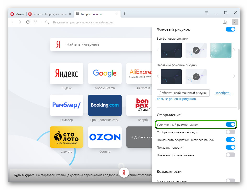 Размер существующих книгодержателей можно увеличить в Экспресс-панели Opera в разделе Дизайн. Просто активируйте элемент, расположенный перед ним.
