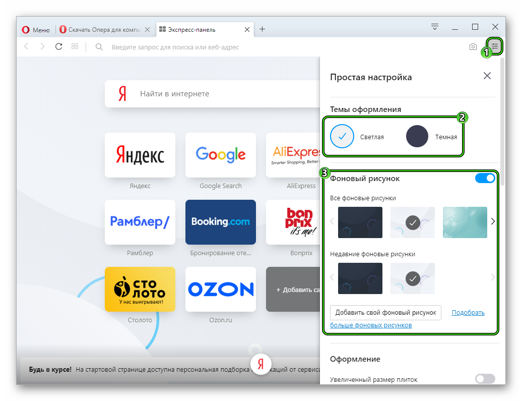 - Доступен выбор темы, светлой или темной. Пусть это и не относится к экспресс-панели, однако это напрямую влияет на визуальное восприятие браузера. Выбирайте ту, при которой вам более комфортно.