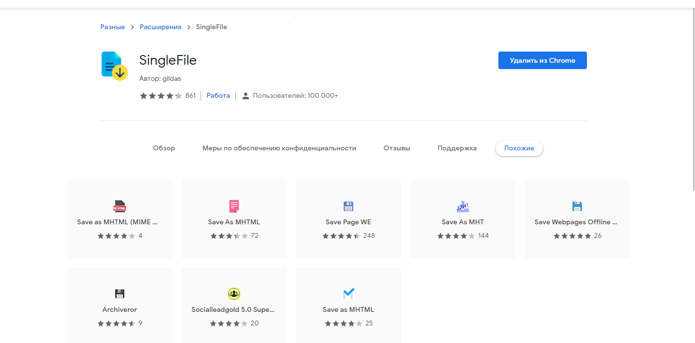 В рамках этого расширения доступны различные варианты сохранения данных с веб-страницы (доступны дополнительные возможности). Информацию можно сразу же сохранять в архив. Расширение SingleFile позволяет сохранять весь контент с веб-страницы кроме видеофайлов в один файл, что очень удобно при его отправке другим пользователям.