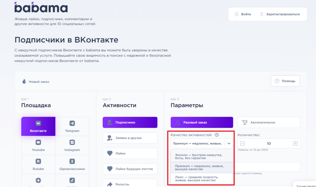 Babama — это про приятный интерфейс, высокую скорость и качество накрутки. Сервис предоставляет широкий ассортимент услуг на 16 площадках. В VK, кроме подписчиков, можно накрутить несколько видов просмотров, прослушивания и прочие услуги.