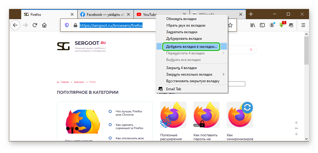 Нажать в открытом функциональном меню на строчку «Добавить все закладки во вкладки». Эта опция сохранит все имеющиеся на панели вкладок веб-ресурсы в браузере. В любой момент можно открыть закладку в Firefox.