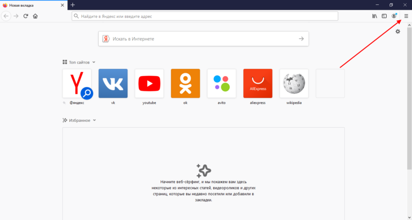 - Открываем на компьютере мозилу и в верхнем правом углу кликаем по кнопке в виде трех линий.