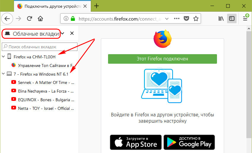 Здесь же, на боковой панели при выборе облачных вкладок и будем отслеживать в дальнейшем все вкладки сессий в Firefox, установленном на других компьютерах, планшетах и смартфонах.