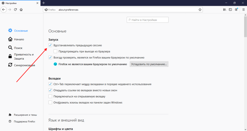 Теперь после выключения мозилы все активные вкладки будут сохраняться, и вы сможете просмотреть их при следующем запуске. Отключить данную опцию вы всегда сможете в том же разделе.