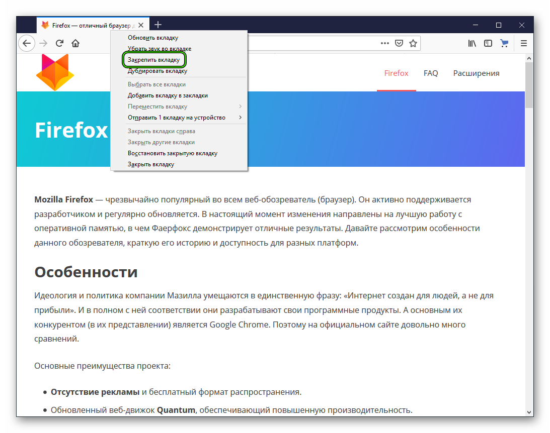 Еще одна функция, о который мы уже немного упомянули – это закрепление вкладок. Она позволяет закрепить выбранную вкладку на всё время. То есть, если при сохранении вкладок выполняется сохранение только предыдущей сессии, то при закреплении вкладок, вкладки будут всегда отображаться в строке активных страниц.