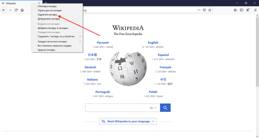 - Открываем в браузере Mozilla Firefox нужную вкладку, которую нужно закрепить. Затем в верхней части браузера кликаем правой кнопкой мыши по данной вкладке.