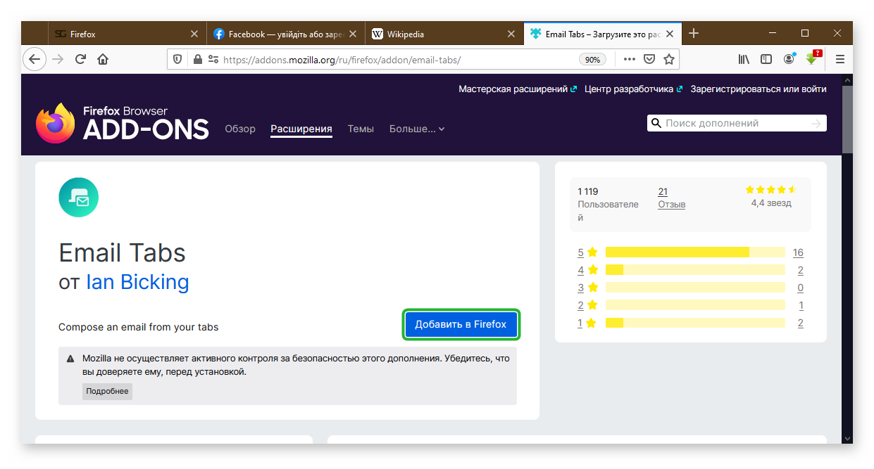 - Открываем каталог Mozilla и в строке поиска пишем запрос Email Tabs или просто проходит сразу на страницу загрузки расширения.