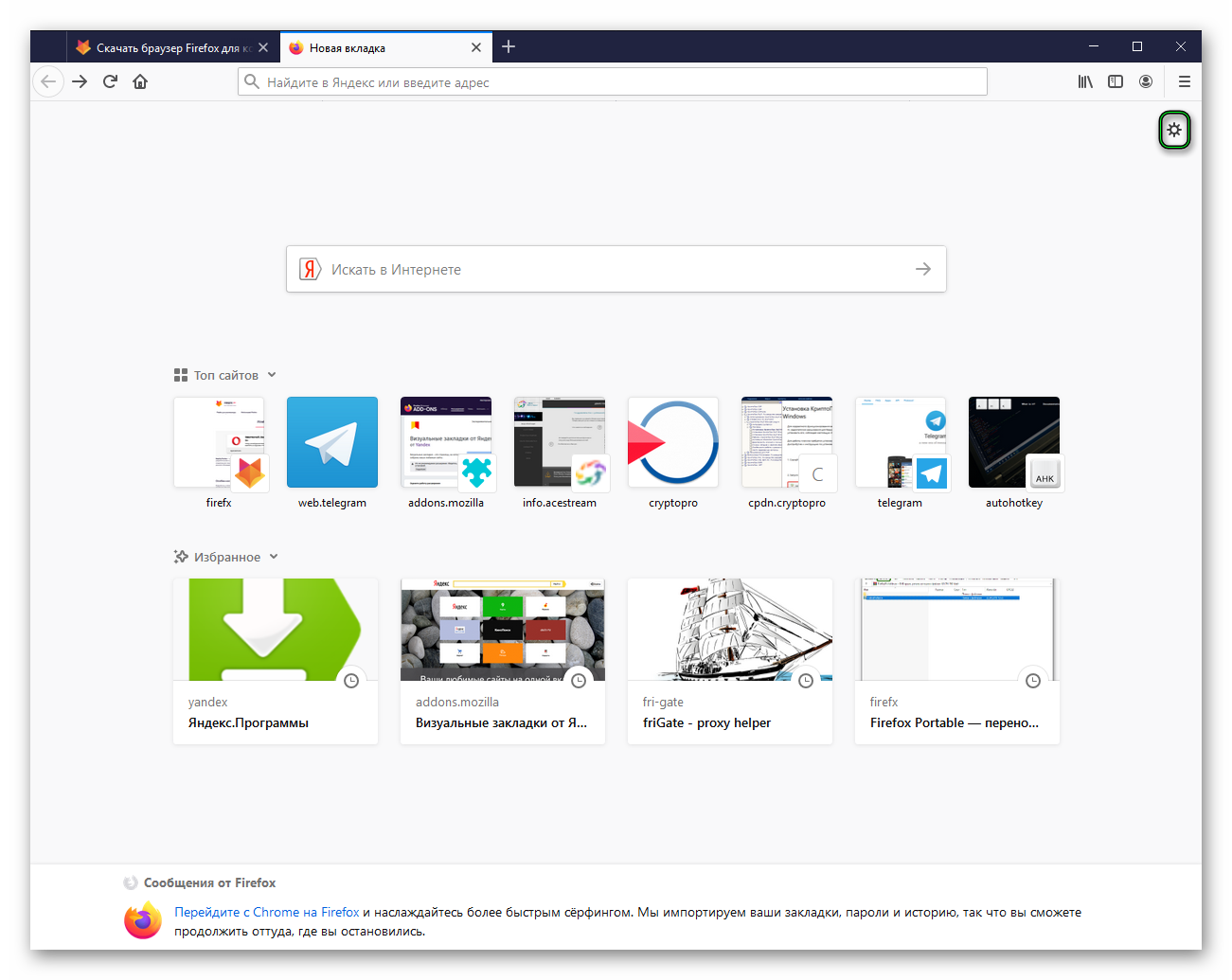 При ознакомлении с браузером Firefox с самого начала пользователь столкнётся с миниатюрами разработок Mozilla Corporation на странице новой вкладки, которые будут вытесняться часто посещаемыми и недавно закрытыми интернет ресурсами. Далее тут будут отображаться и сохранённые пользователем фавориты и просто полезные ссылки на сайты.