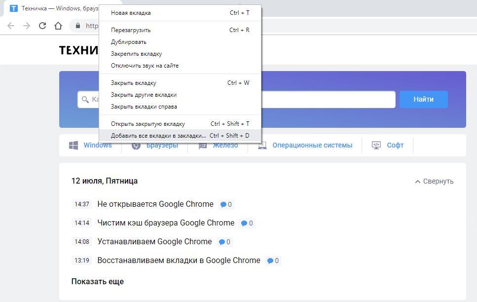 - В этом окне используйте сочетание клавиш Ctrl + Shift + D или перейдите в «Закладки» > «Добавить все вкладки в закладки» через меню с тремя точками.