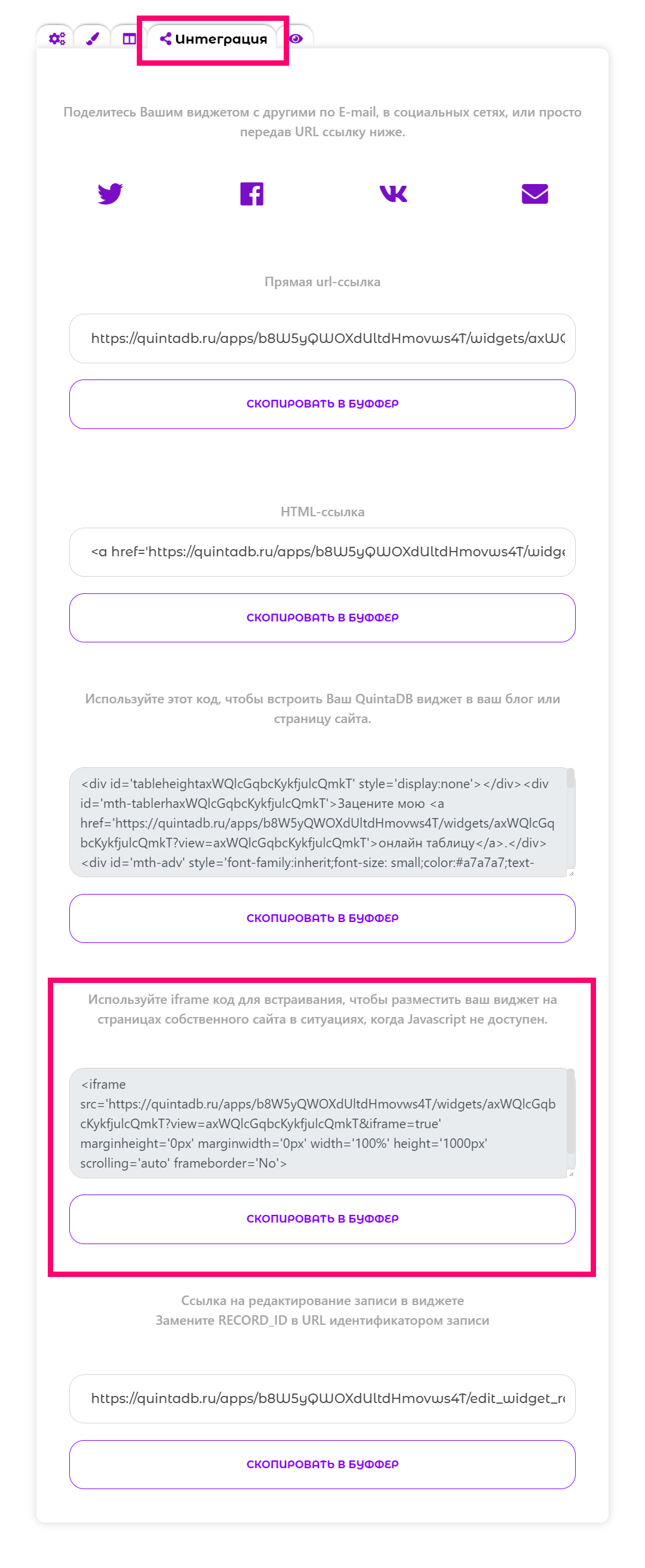 Дальше для интеграции базы данных на веб-сайт перейдите во вкладку Интеграция, скопируйте iframe код для вставки и разместите его на подходящей страничке веб-сайта. (Нажмите на картину, чтоб прирастить)