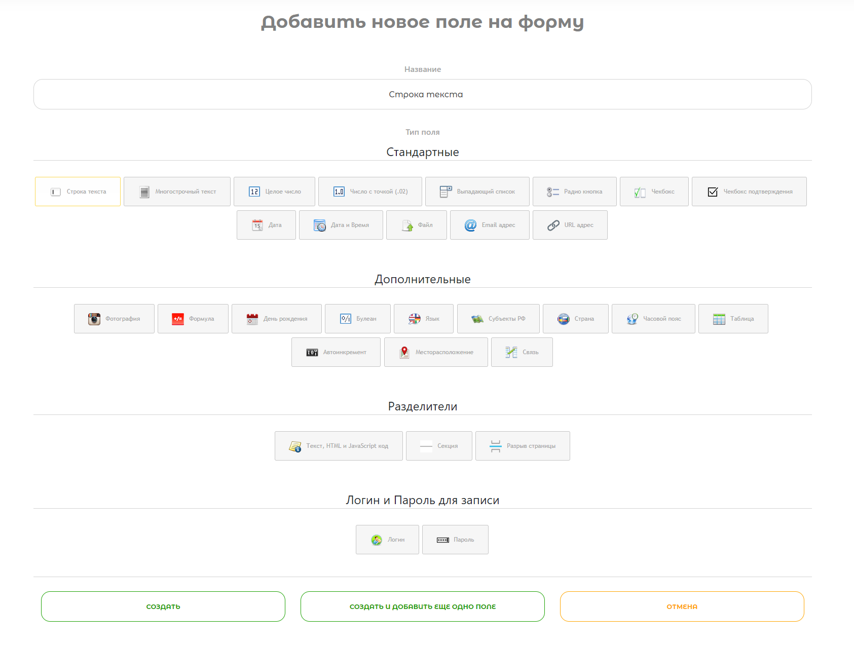 Сейчас добавим несколько полей на форму, которые будут служить колонками в таблице данных. Для прибавления поля жмем клавишу «Добавить новое поле на форму«, указываем заглавие поля и его тип, который описывает тип вводимой в данное поле инфы (текст, числа, файлы и т.д.).