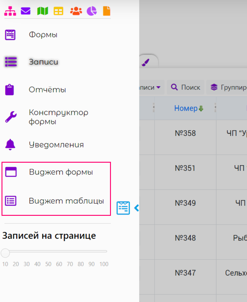 Чтоб настроить функциональность формы либо таблицы базы данных, перебегаем в меню «Виджет Формы» либо «Виджет Таблицы«.