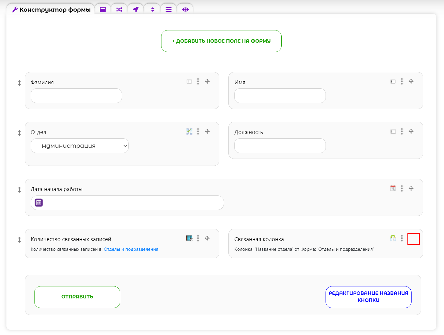 Как следует поля в данном ряду будут заблокированы для перемещения во избежание образования пустого ряда на форме. Если для вас нужно переместить данные поля, то включите у всех полей опцию «Демонстрировать поле на форме» и переместите поля в нужные места.
