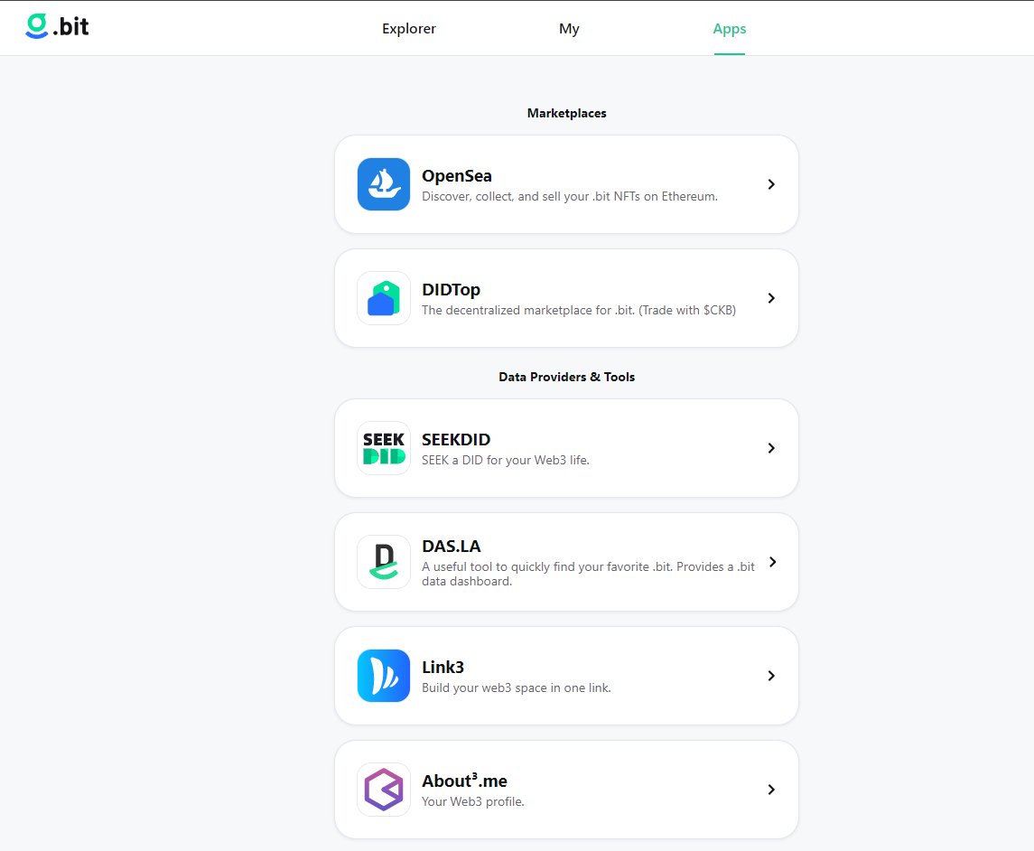 Вы также можете проверить список совместимых приложений Web3 dApps где вы можете использовать свой домен .bit в качестве источника данных.