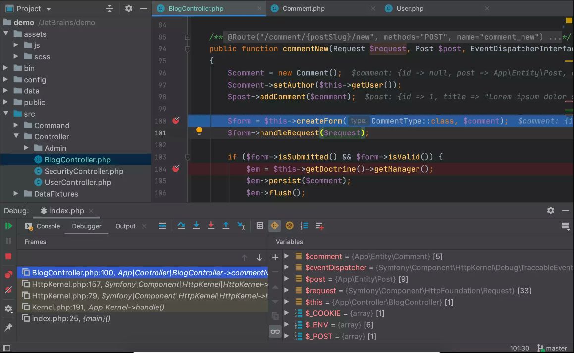 PhpStorm — это уже не просто редактор, а полноценная IDE от известного разработчика JetBrains. Он предназначен для веб-разработчиков и поддерживает все необходимые языки и фреймворки в этой области. Как и всякий IDE, он предоставляет возможность исполнения и отладки кода.