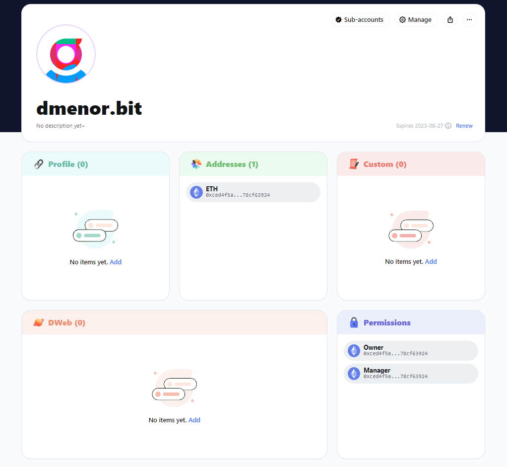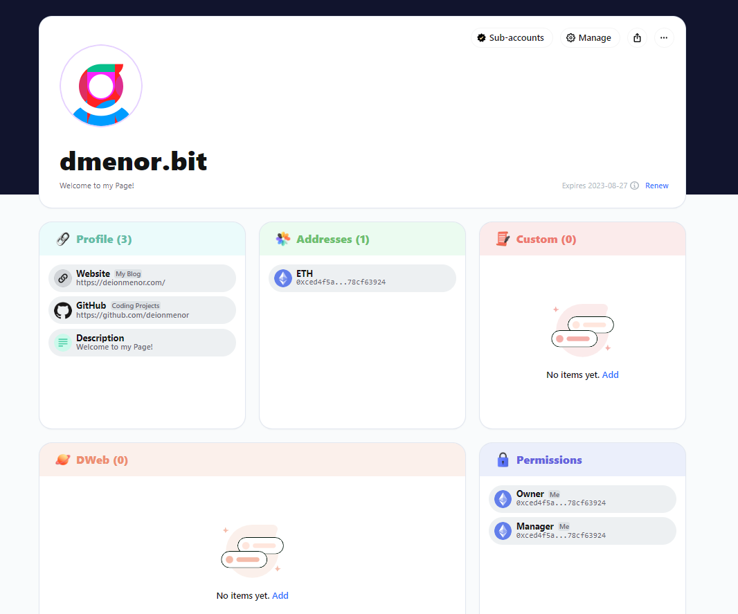 Ваш профиль будет доступен через URL-адрес в формате . По умолчанию ваш профиль будет включать адрес кошелька, который вы использовали при настройке домена.