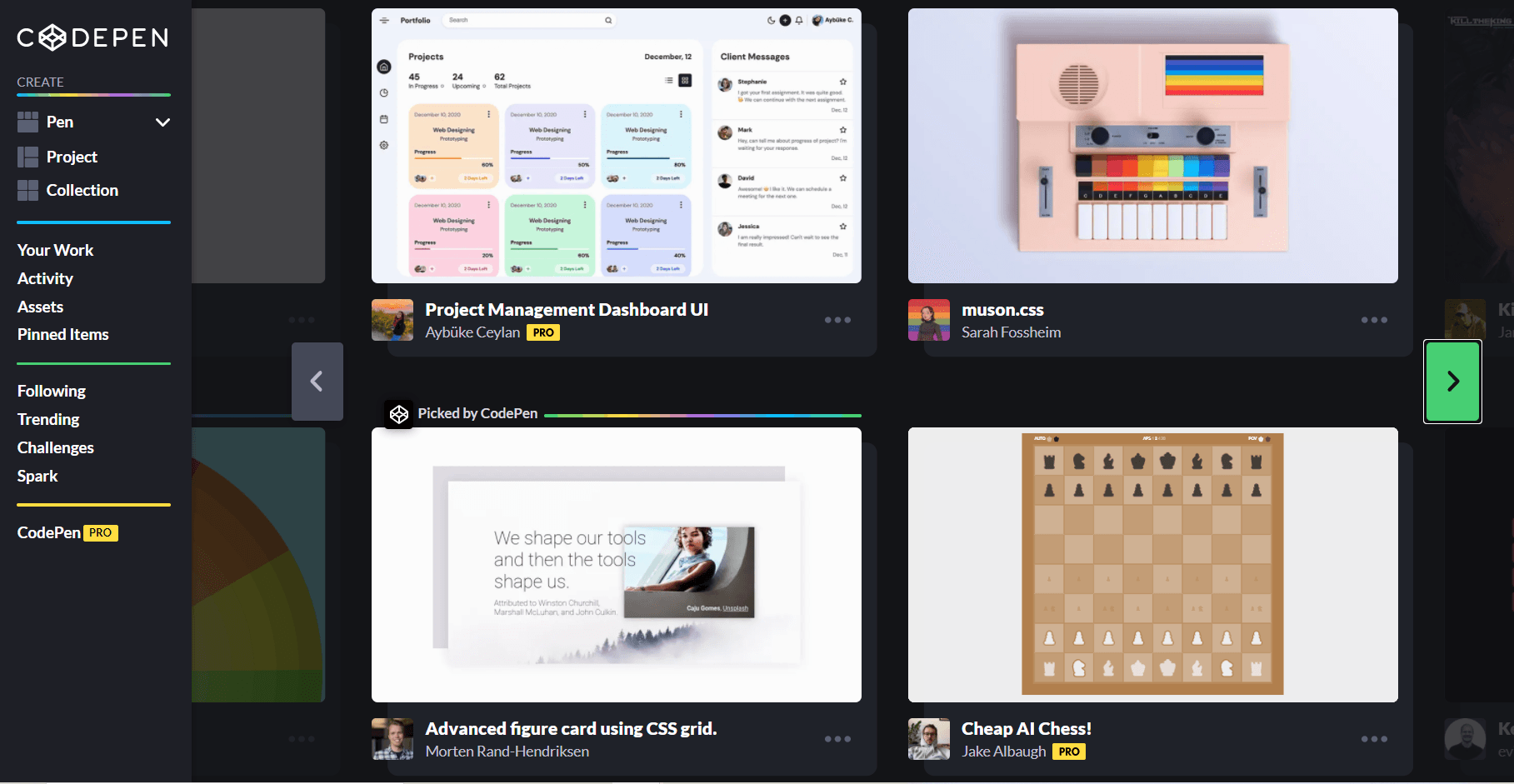 Часть онлайн-редакторов вышли за рамки стандартных песочниц и создали ленты с трендами и примерами работ. В их числе Codepen и Plunker. На этих ресурсах можно подсмотреть реализацию современной вёрстки и стилизации, трендовой анимации, а также примеры программ других пользователей. Весь код в открытом доступе, поэтому можно черпать вдохновение и разбираться, как решена та или иная задача. А еще онлайн-редакторы позволяют сразу увидеть и структуру кода, и его отрисовку в браузере. Поэтому ссылки на свои лучшие работы можно добавлять не только в ленту с трендами, но и в портфолио.