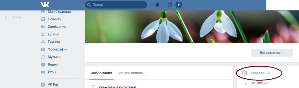 Открываем главную страницу своего сообщества. На боковой панели выбираем вкладку «Управление».