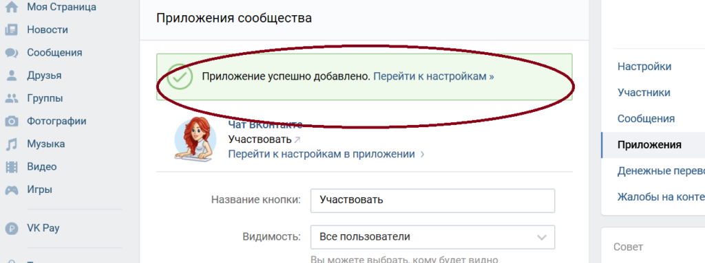 Появляется окно с надписью о том, что «приложение успешно добавлено» и с возможностью провести минимальные настройки. Первоначально можно указать, кому будет доступен созданный «групповой диалог». Например, можно выбрать строку «Только подписчики».