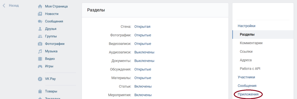 Войти в управление сообществом и справа внизу выбрать «приложения» (рисунок 7).