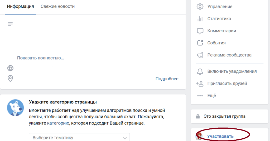 Теперь, если войти в группу, то справа в меню группы появилась кнопка «участвовать» — это переход в чат для общения (рисунок 10).
