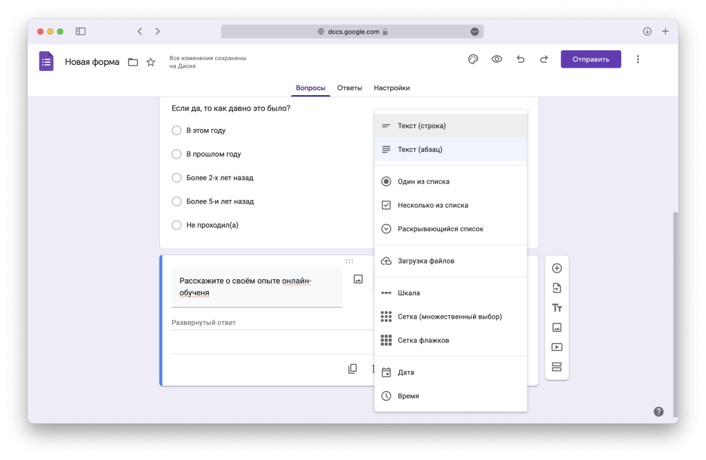Необязательные вопросы удобно делать для того, чтобы вводить условие задач или пояснять технические особенности проекта. Но если все же хочется получить ответ в формах, нажмите на кнопку управления в правом верхнем меню и выберите необходимый формат.