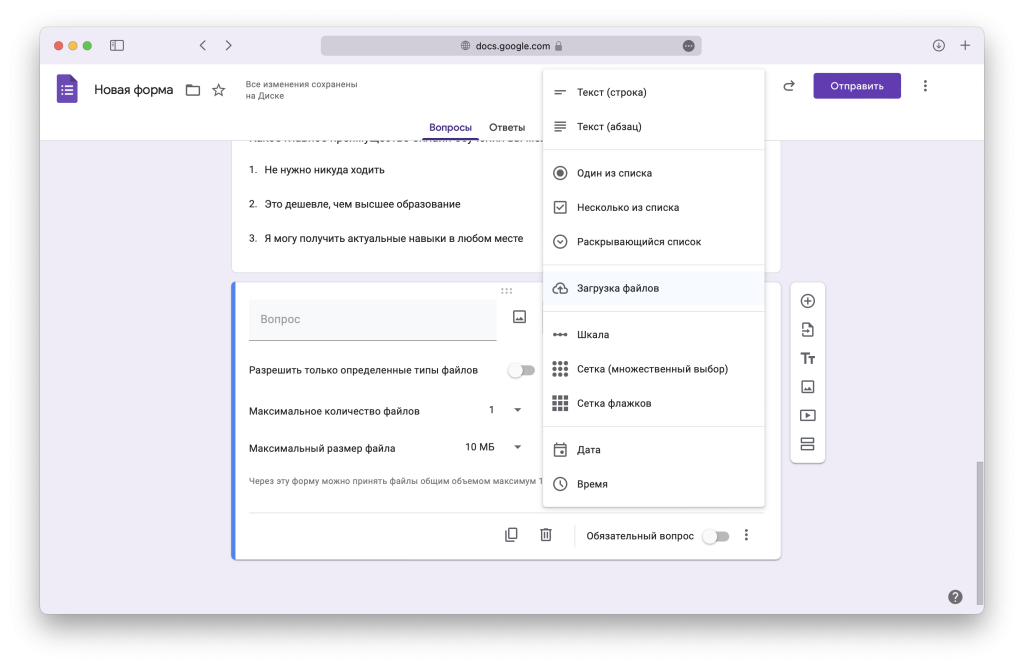 5. Загрузка файлов — в данном типе вопросов от пользователя потребуется загрузить файл. При этом в настройках можно указать как размер файла, так и его тип.