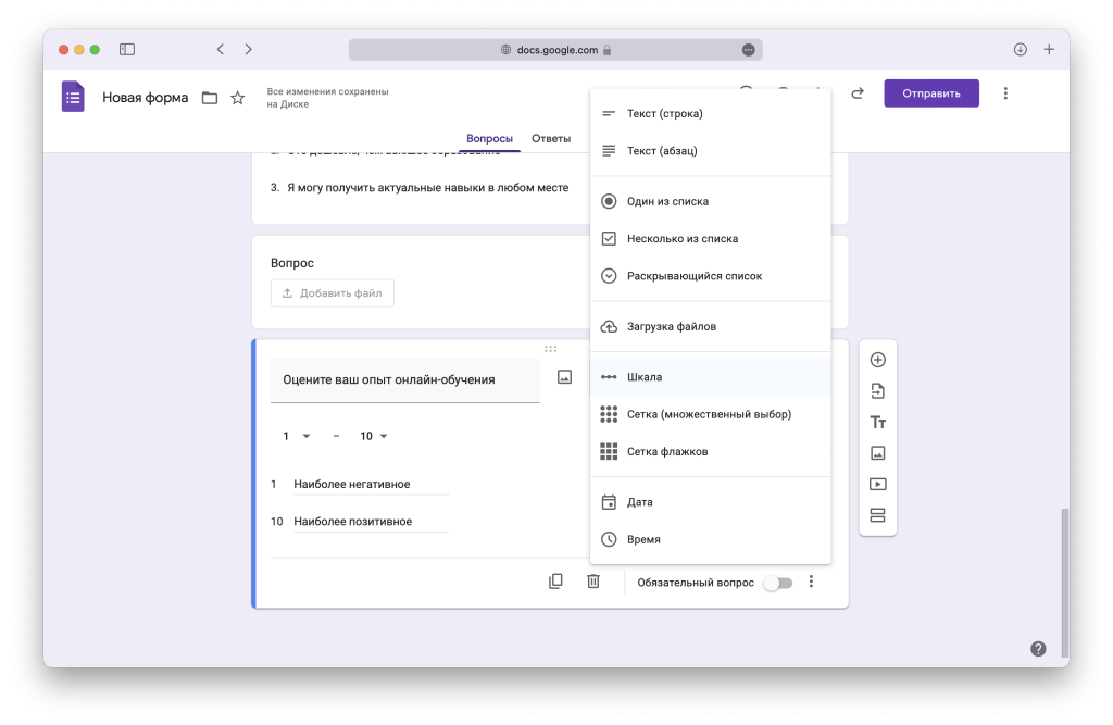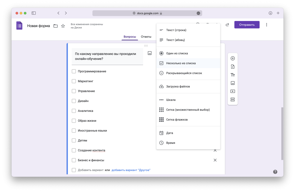 Внутри гугл-форм реализовано сразу несколько типов вопросов, из-за чего практически любой запрос внутри анкетирования можно так или иначе изобразить и дать возможность опрашиваемому ответить: