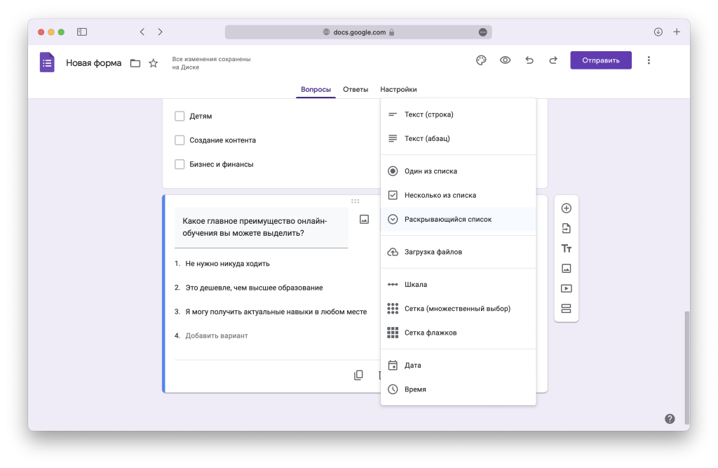 - доступность — находясь в любом месте и в любое время, пользователь может работать с приложением. Хранятся Гугл Forms для опроса на Google Диске;