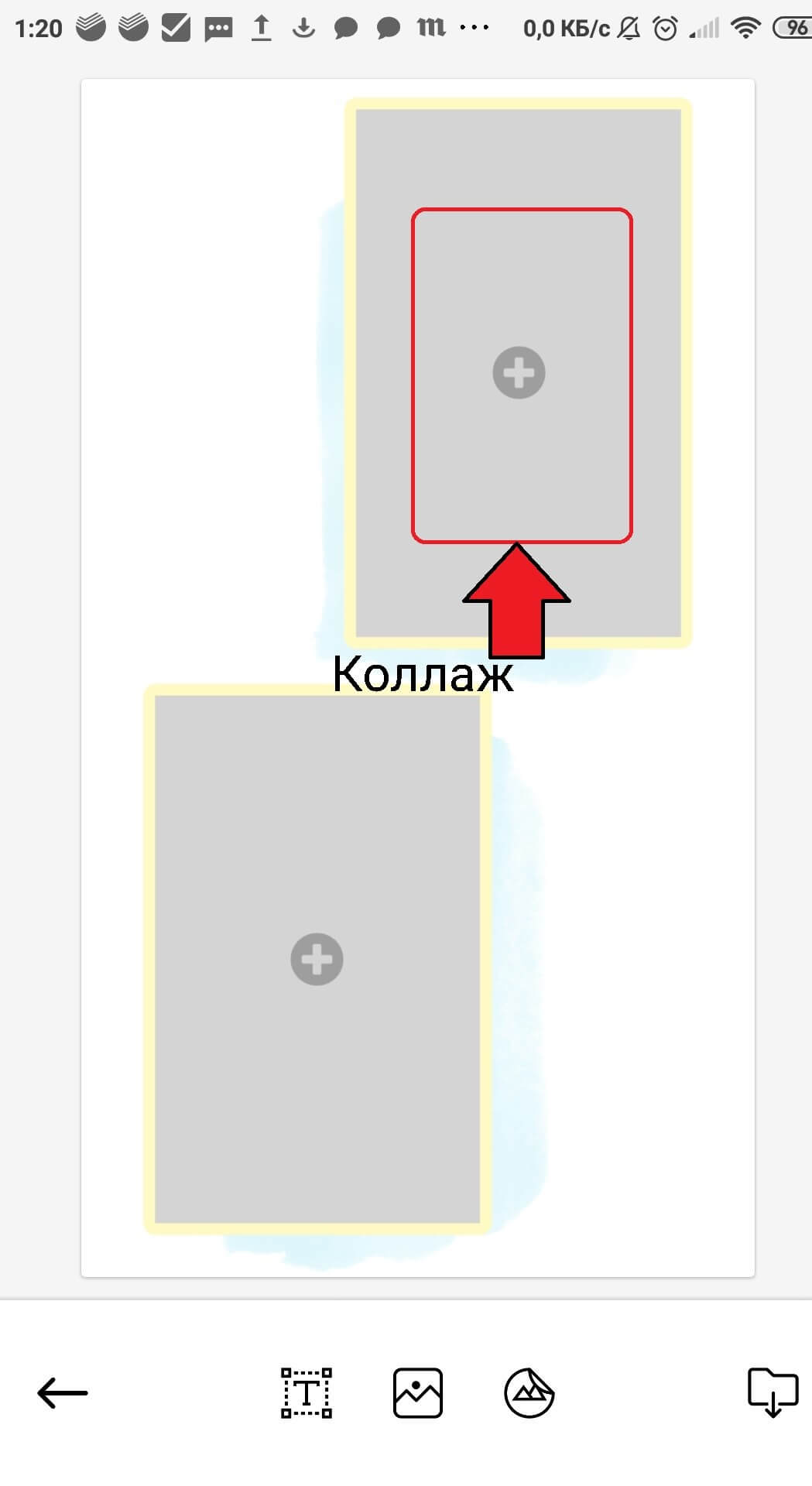 Текст добавится в коллаж. Можно перейти к загрузке видеофайлов. Нажмите на зону со знаком «+» и выберите из галереи необходимый файл.