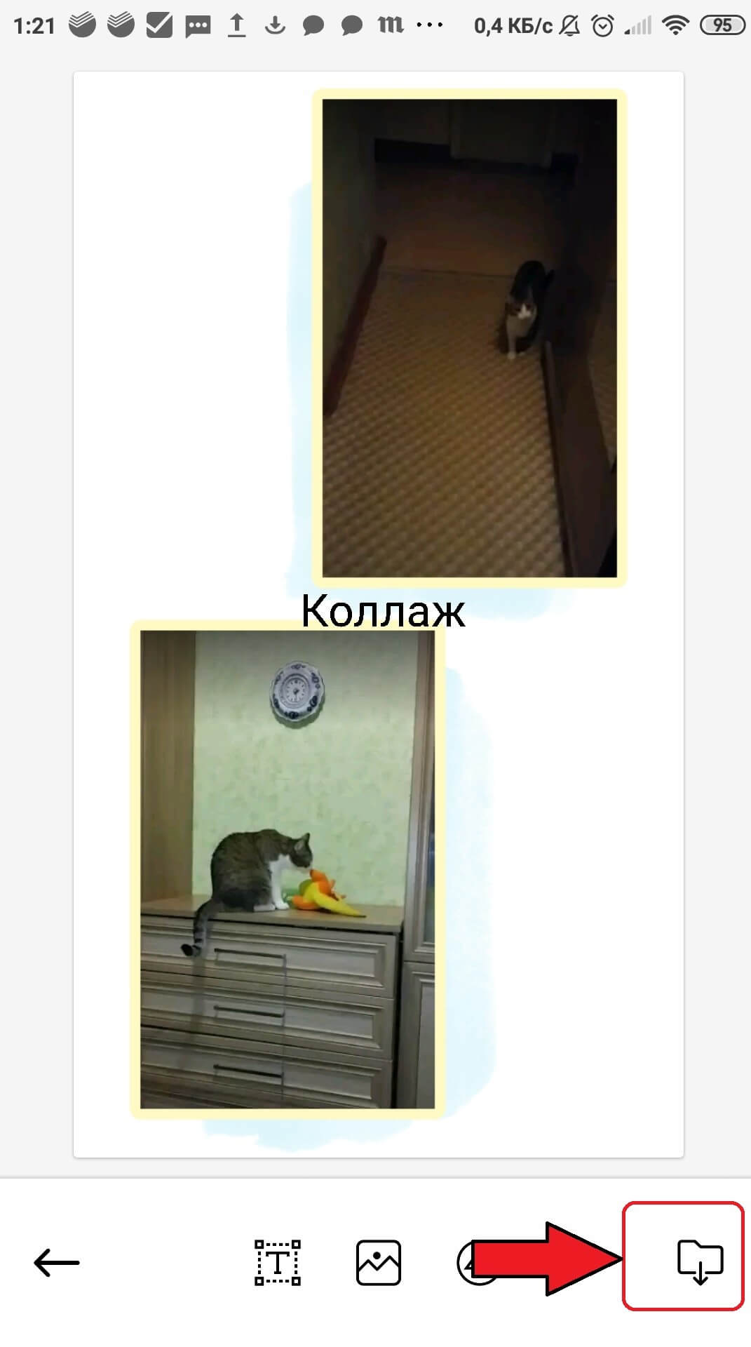 По аналогии добавьте второе фото. Когда создание коллажа будет завершено нажмите «Сохранить» в правом нижнем углу, чтобы отправить его в галерею.