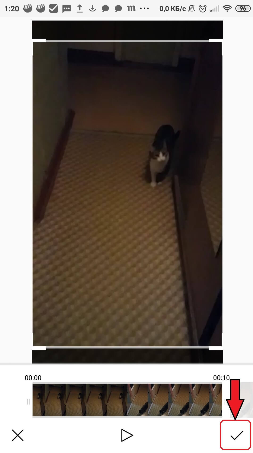 Видеофайл можно обрезать, если необходимо. Когда закончите редактирование, нажмите на «галочку» в правом нижнем углу. Обработка файла займёт некоторое время, после чего изображение появится в коллаже.