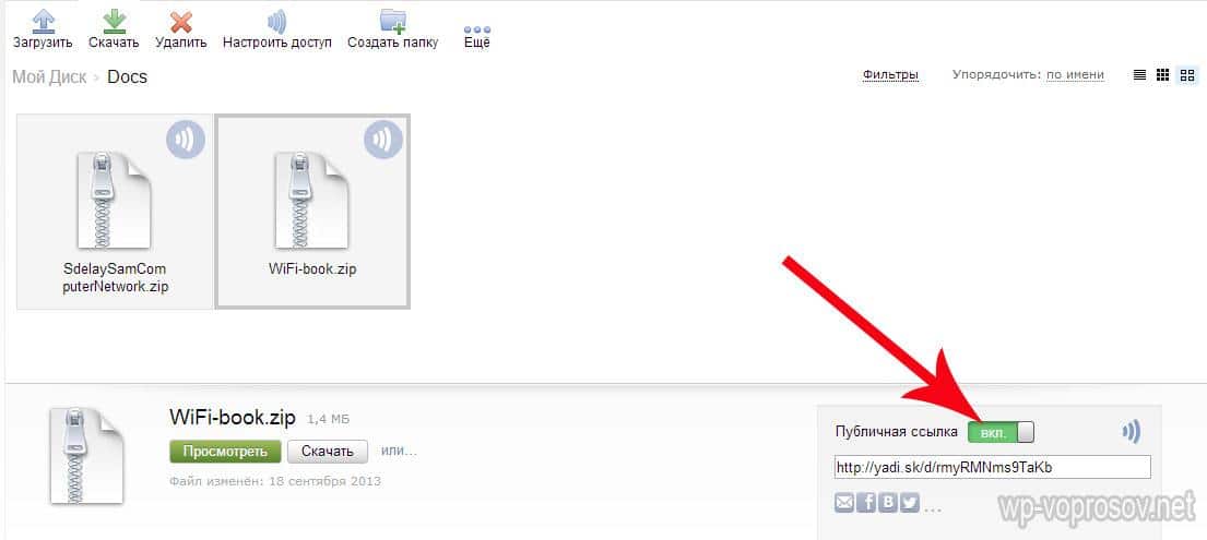 Для того, чтобы ваши друзья могли эти файлы скачать, кликните по загруженному документу и переведите ползунок «Публичная ссылка» в положение «ВКЛ». Полученную ссылку можно размещать на сайте и давать пользователям. но учтите, что если вы этот файл уберете из общего доступа, а потом опять включите, то адрес ссылки поменяется.