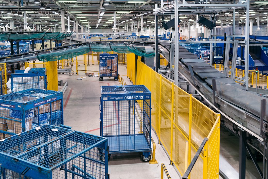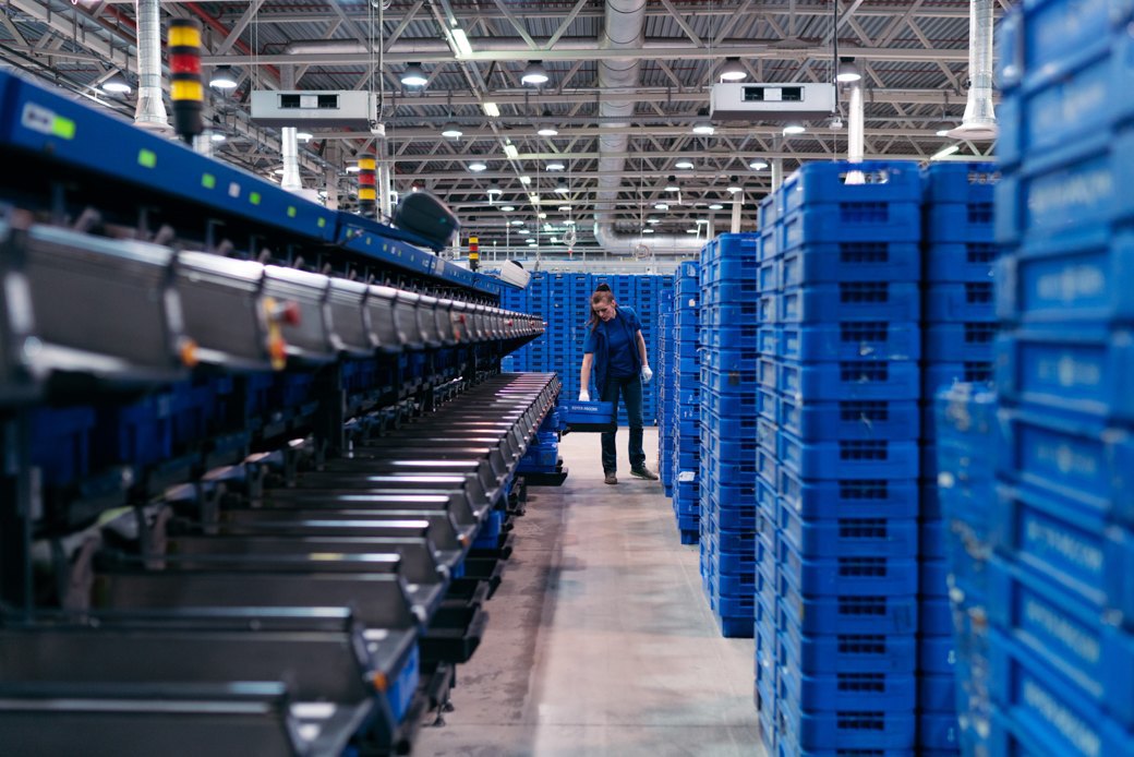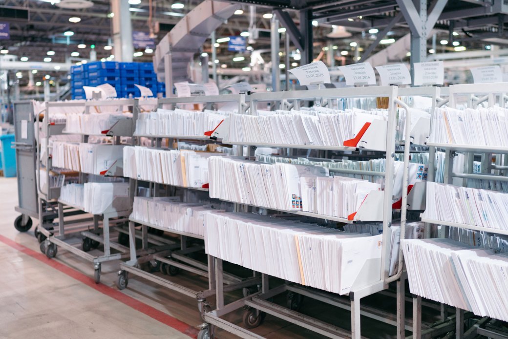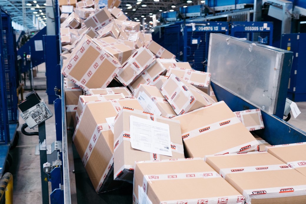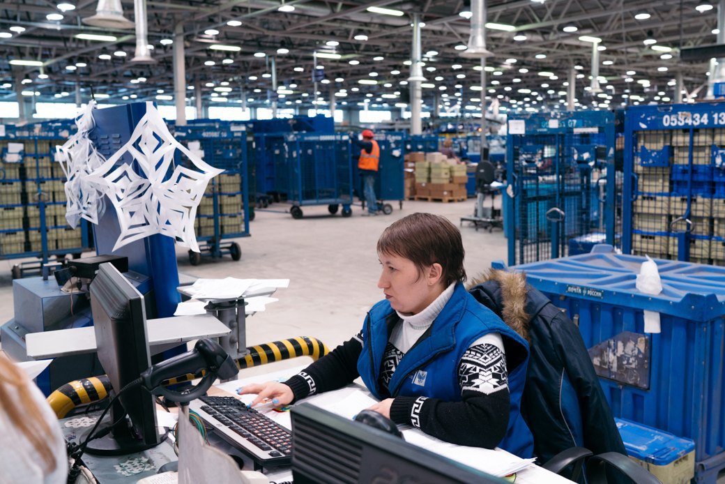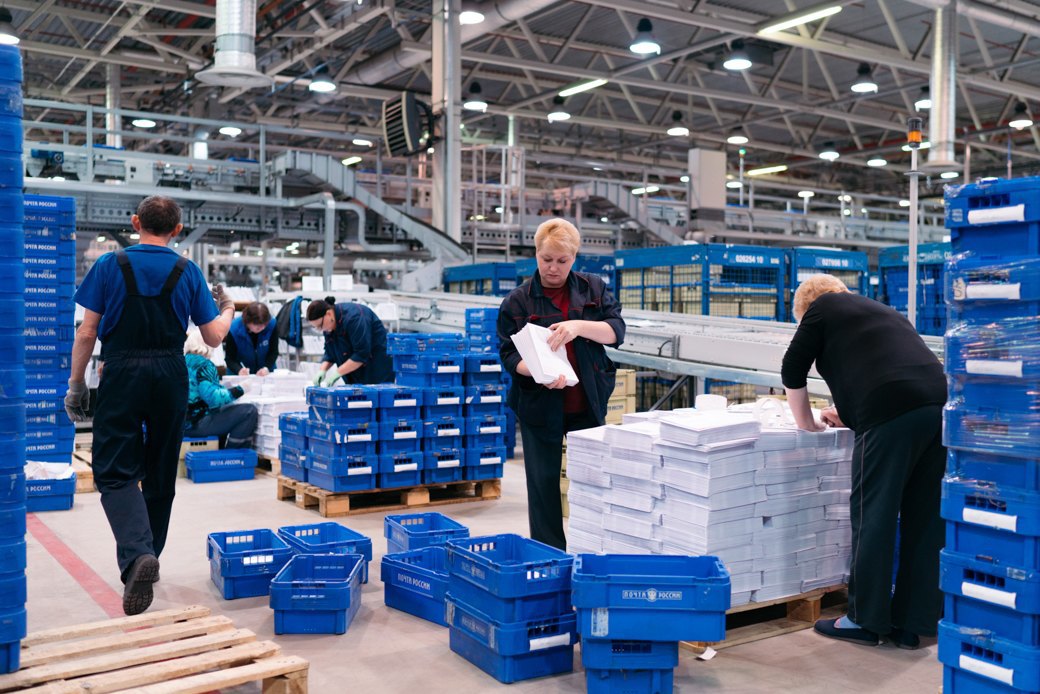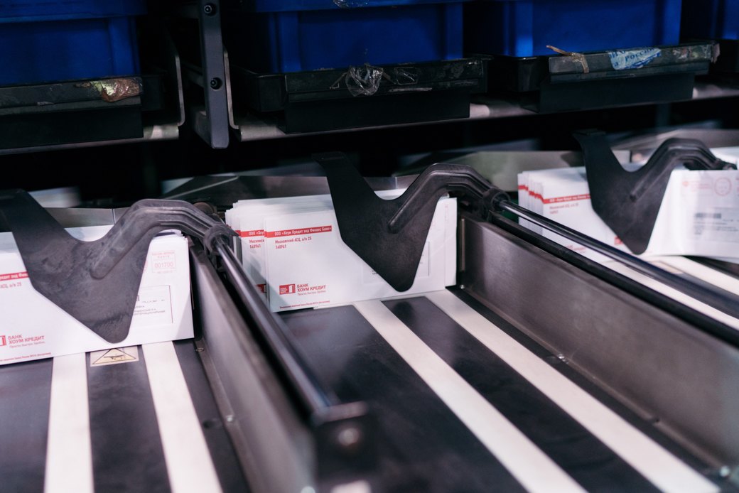 Потом письма вынимают из ячеек, и оператор складывает отправления в синие фирменные ящики, наклеивает ярлыки с адресами отделений или почтамтов и ставит боксы на конвейерную ленту. Здесь их ждут последние этапы — формирование в контейнеры, загрузка и отправка.