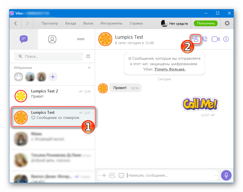 - Кликаем по значку «Добавить», расположенному справа от имени участника с которым ведется диалог через Вайбер для Виндовс.