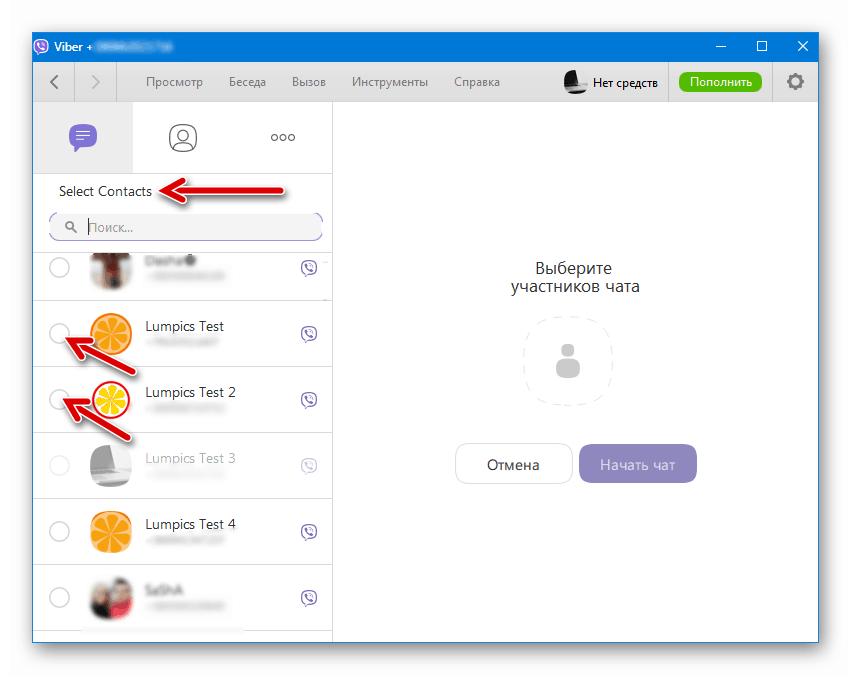 В области «Select Contacts» слева окна проставляем отметки возле имен участников создаваемого группового чата.