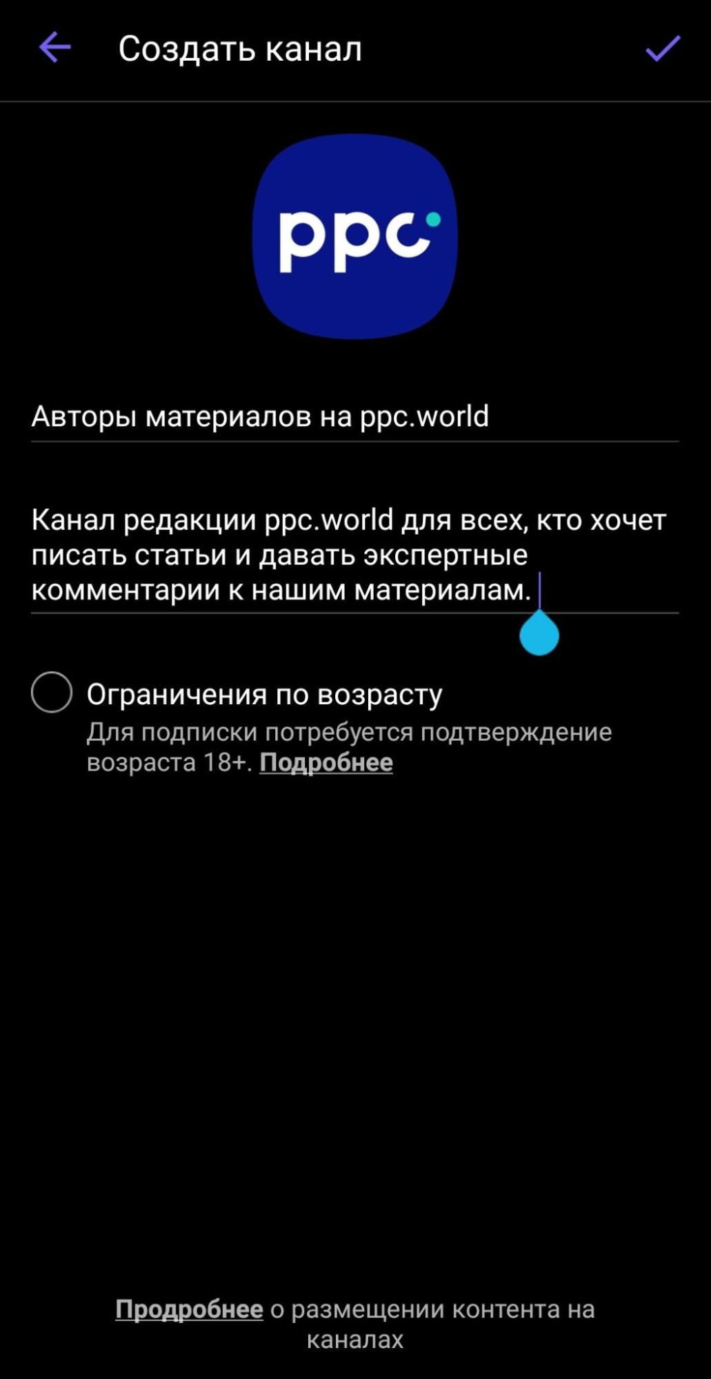 Шаг 2. Заполняем профиль канала: выбираем название (оно должно отвечать правилам Viber), добавляем описание и загружаем обложку. Обложка будет показываться так же, как в обычном профиле пользователя — в виде маленькой иконки.