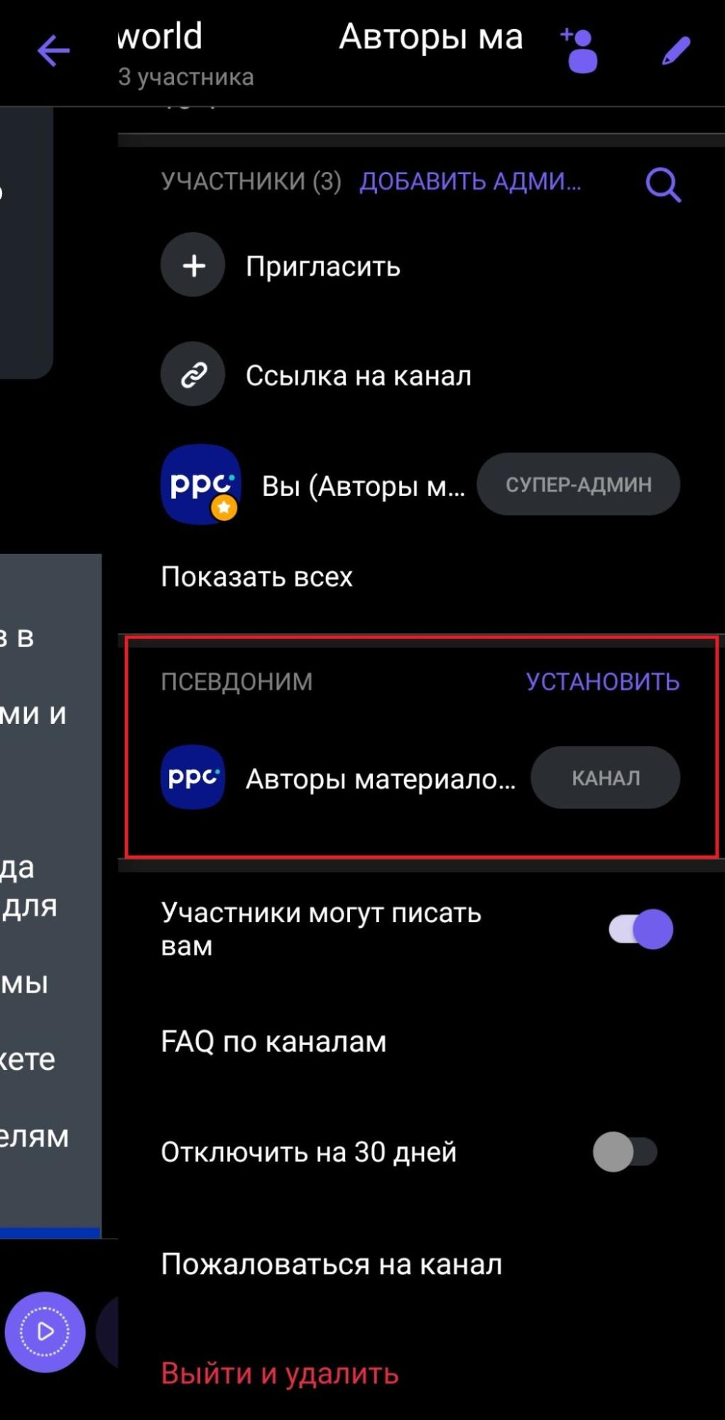 Шаг 4. Выбираем псевдоним администратора. Для этого нужно кликнуть на всплывающее уведомление или зайти в настройки канала. Это необязательная функция — можно не скрывать от подписчиков свое имя. По сути, для создания псевдонима нужно заполнить еще один свой профиль — указать имя и поставить аватарку.