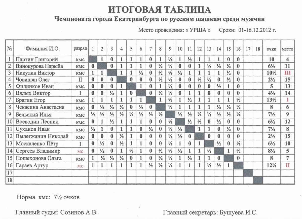 По окончании партии организатор вносит в первую таблицу результат игры для соответствующего тура.