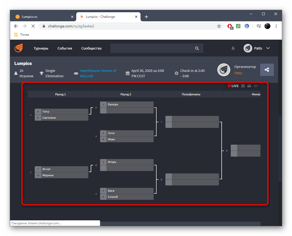 Функциональность онлайн-сервиса Challonge сосредоточена на создании турнирных таблиц и управлении ними. Преимущество этого инструмента над другими — открытая регистрация для пользователей с возможностью им самим управлять исходом матча, подтверждая или опровергая итог. Для всех желающих зарегистрированных юзеров открывается и возможность голосовать за каждую пару или конкретного игрока.