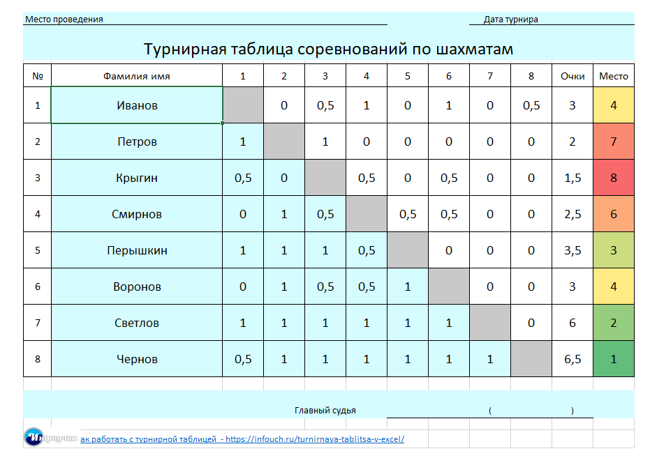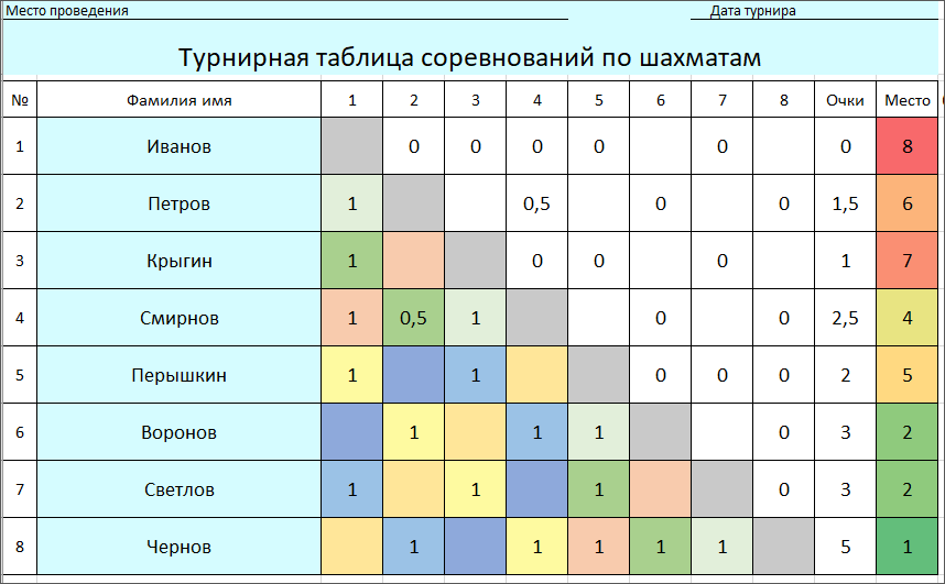 По мере внесения результатов в таблицу автоматически происходит подсчет суммы баллов для каждого игрока. А в столбце «Место» показывается текущий рейтинг игрока в турнире. Для большей наглядности используется цветовое выделение занятого места в рейтинге. Шкала цвета от зеленого (наивысший балл) к красному (наименьший балл).