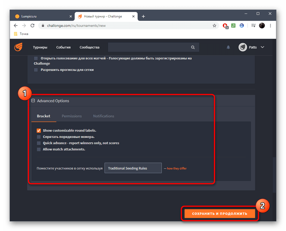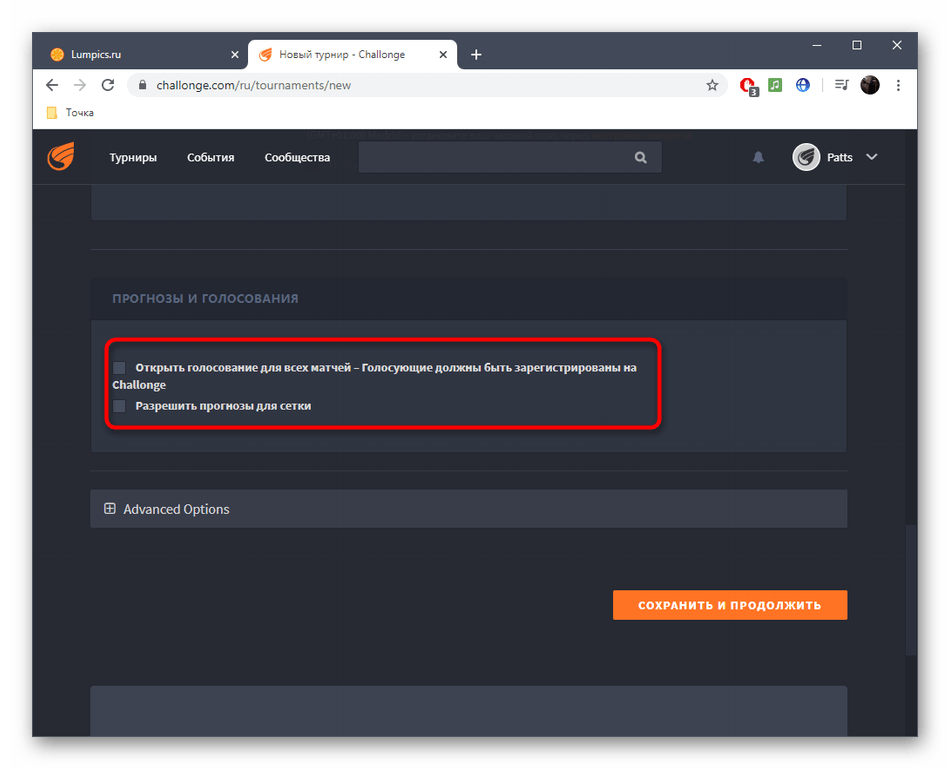 Дополнительно ознакомьтесь и с «Advanced Options»: здесь есть мелкие настройки, относящиеся к внешнему виду таблицы и ее генерации. При готовности остается только кликнуть на «Сохранить и продолжить», чтобы завершить создание турнира.