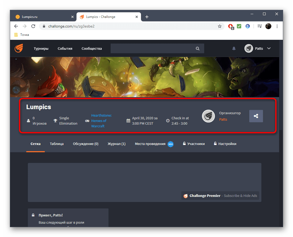 Вся основная информация о текущем турнире будет отображаться на отдельной панели. Здесь вы видите количество игроков, формат, вид спорта или компьютерную игру, дату проведения, время начала, а также можете скопировать ссылку для перехода.